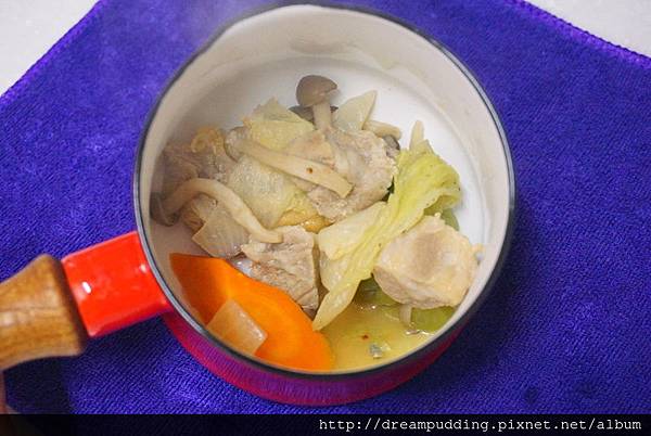 這款是白味增豬腩清湯,內容物有豬腩排、大白菜、鴻喜菇、洋蔥、紅蘿蔔、山苦瓜、信州味噌、韓式辣椒片、奶油。