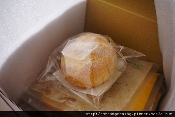 搭配的當然是最佳組合法國小圓麵包啊,從冷凍拿出來室溫回溫再用烤箱烤過,就是熱呼呼的剛出爐麵包。