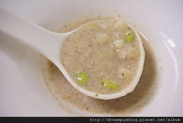 法式野菇濃湯,內容物有毛豆仁、馬鈴薯丁、和切的細碎的菇類,是加了全脂保久乳下去熬煮的湯料包。