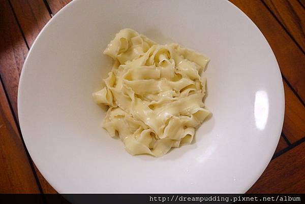 首先將煮熟的麵條撈起瀝乾後放在碗中。