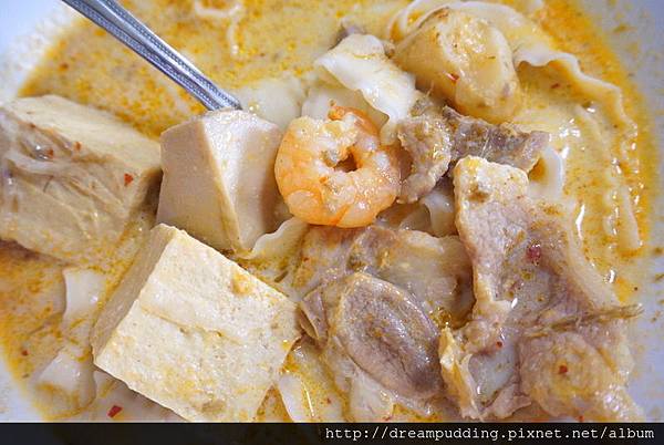 南洋海鮮叻沙湯,我將它煮成南洋風味的湯麵,湯料包裏內容物有豬肉、凍豆腐、馬蹄、蝦仁、洋蔥、叻沙醬;真材實料,我都沒有另外再添加其他肉品或是海鮮之類的。