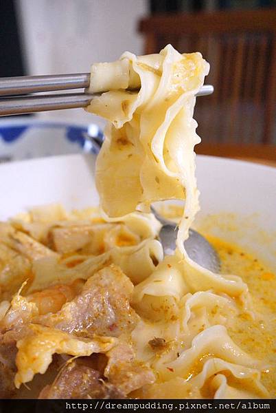 然後再將湯品倒入麵條中,一碗南洋風味的湯麵就完成了