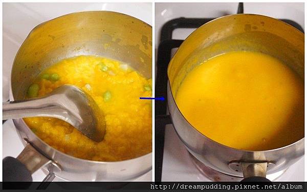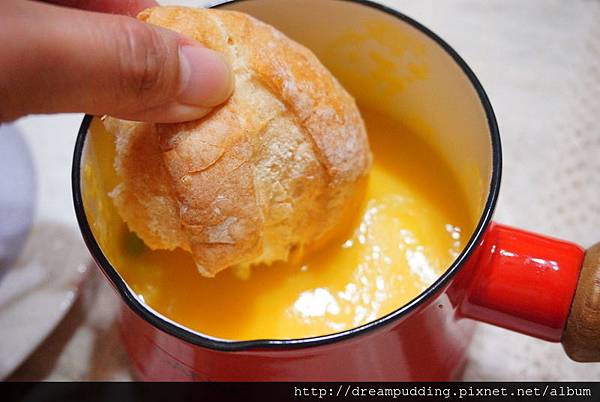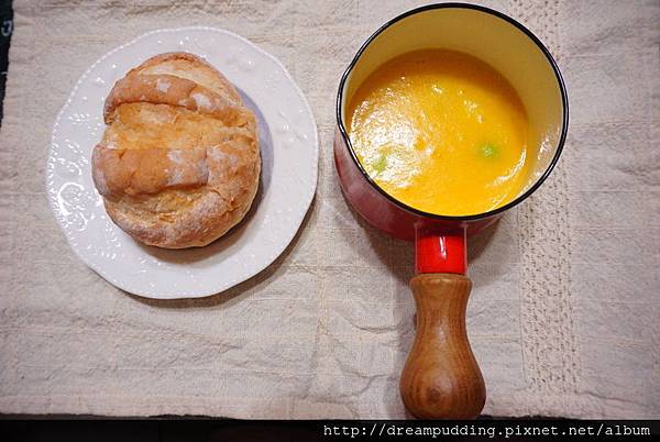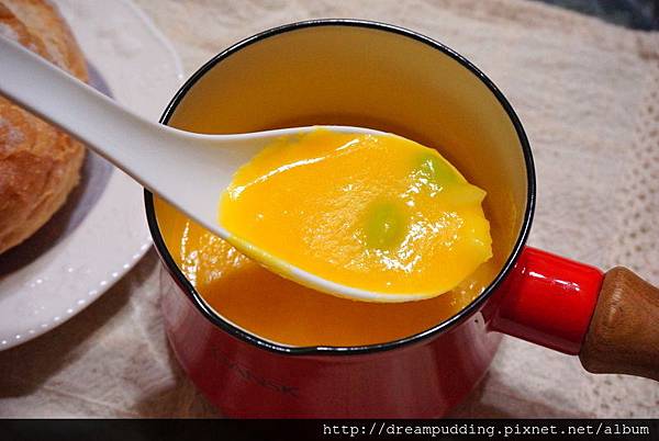 黃金南瓜濃湯也是適合沾取麵包的一款湯品,濃湯類由於接近稠狀,因此下鍋加熱時建議可以先攪拌一下,讓南瓜濃湯泥慢慢隨著熱度融化。