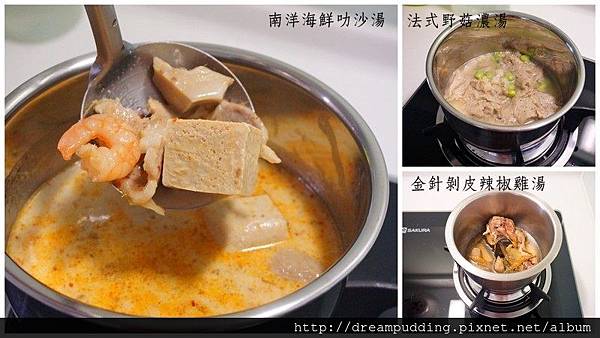 這天打算煮一種湯麵跟兩種湯品,所以帶了3種湯品到友人家,分別是金針剝皮辣椒雞湯、法式野菇濃湯跟南洋海鮮叻沙湯。