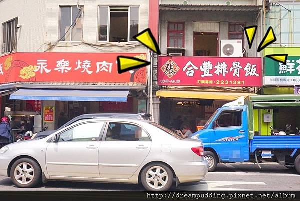 合豐排骨飯位於民族路三段上,左右旁邊是永樂燒肉飯跟鮮茶道飲料店。