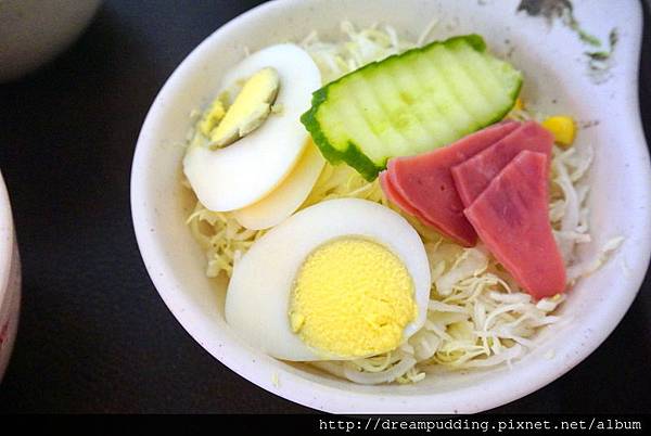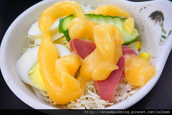 沙拉的高麗菜絲爽脆新鮮,還有火腿、黃瓜跟水煮蛋,極喜歡他的沙拉醬,香甜濃潤。