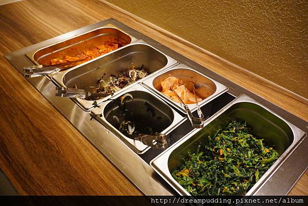 韓式小菜總共有5種可以無限續,一開始服務人員會先送上5小盤,之後要續加到小菜區夾取就可以了。