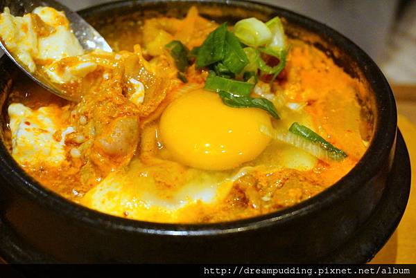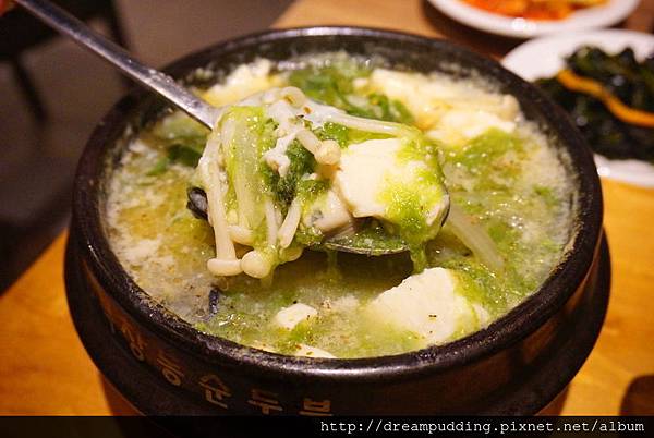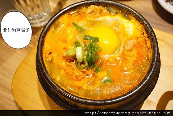 北村的豆腐煲採用韓式湯頭、精選豆腐、附有產銷履歷的牧場直送雞蛋以及自家手作豆漿。北村嫩豆腐煲湯頭濃郁帶點清甜跟細微的辣,豆腐給的很多,肉片也不少。