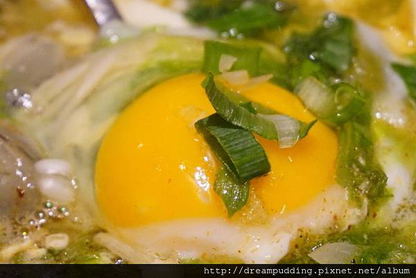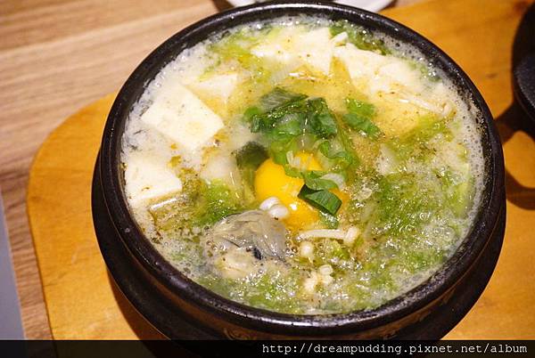 海菜鮮蚵嫩豆腐煲,這個金黃的蛋黃真的很迷人,後來我把它撈起來放到鐵鍋裡拌飯。