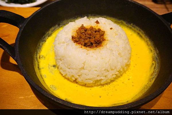 友人還把豆腐煲裡那個蛋黃放到了鐵鍋飯上,他跟我一樣很熱愛半熟蛋拌飯。