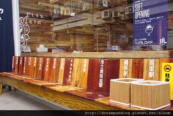 門口的木椅上頭印著沖繩電車的車站名,對老闆而言,這些站在他的人生裡都寫下了一段故事。