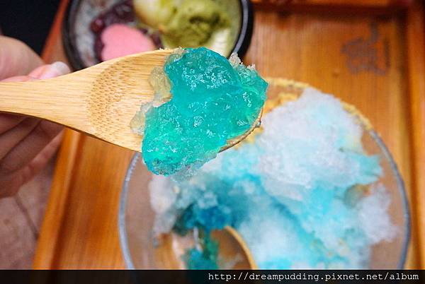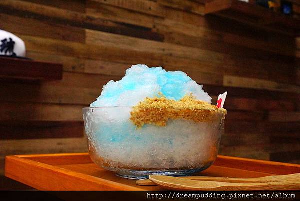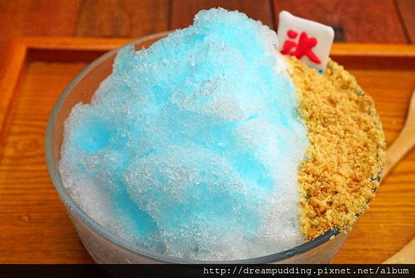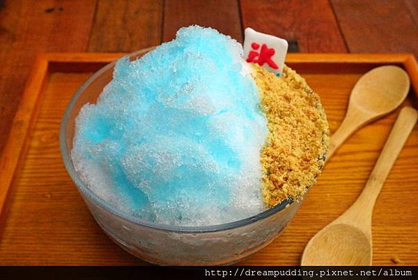 清涼的剉冰那一抹藍是藍柑橘特調,採用日本進口的夏威夷syrup果糖漿,土黃色的是略帶粗粒感的餅乾屑屑。