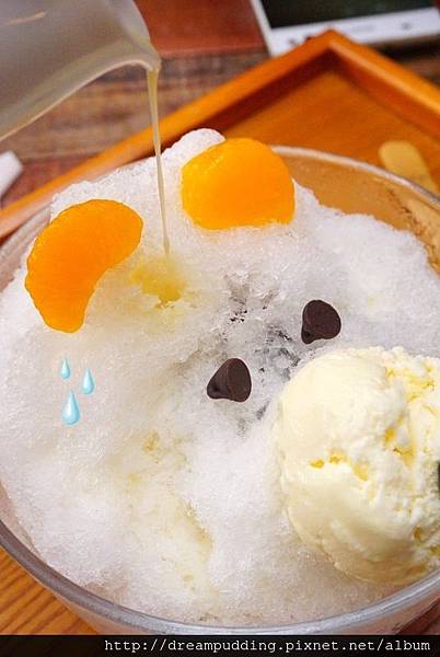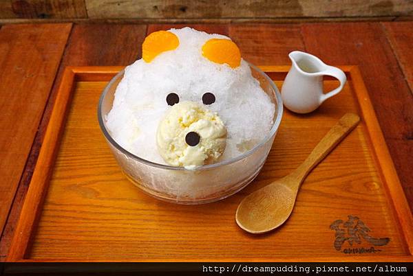 OKI君,NT 120元。小熊造型冰,會附上一盅牛奶淋醬,耳朵是香甜的小橘子,眼睛是巧克力豆,冰淇淋則是日本的牛奶冰淇淋,還會撒上一些沖繩產的雪鹽提味。