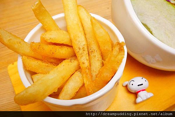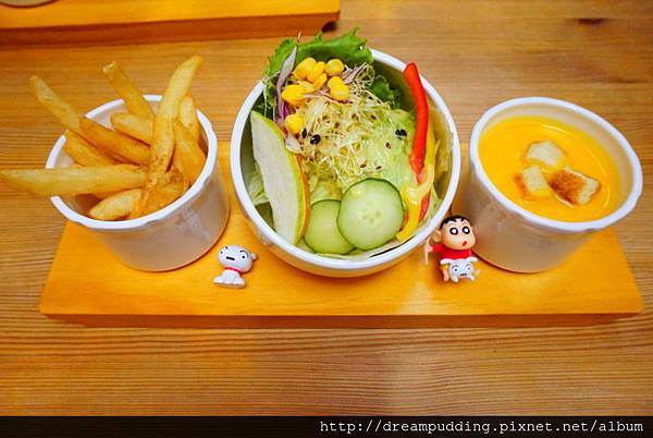 附餐的薯條、沙拉跟濃湯,小白跟小新是我帶出門散步的。