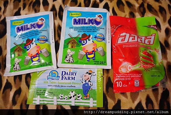 跑了很多超商跟超市都買不到很火紅的泰國皇家牛乳片,就買了其他牌子的,雖然也不錯吃,但我還是愛泰國皇家牌。右手邊的紅綠包裝是隨手買的糖果,酸甘酸甘的。