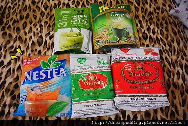 沖泡飲品茶包類買了這些,上方是沖泡式的抹茶拿鐵跟抹茶麥片,底下都是泰式茶類,紅色跟綠色是整包的茶葉粉狀,紅色是泰式茶,可以加入煉乳;綠色是泰式綠奶茶;可以依自己喜好調整茶葉濃淡,大包的喝比較久;最左邊的是雀巢泰式奶茶,已經分裝好條包粉狀,老實說,很甜,非常,但甜得很濃厚香醇,我竟然很喜歡>////<