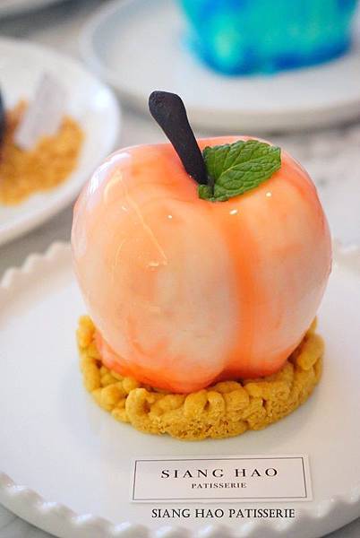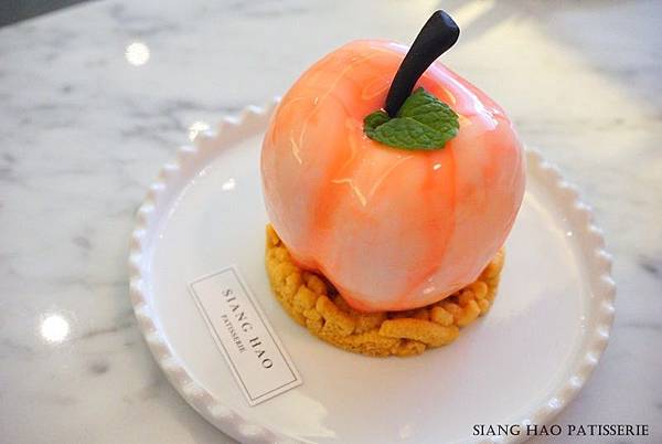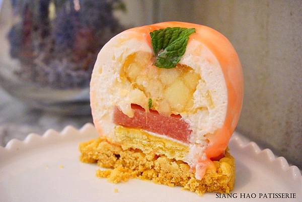 整體是由新鮮水蜜桃、水蜜桃果凍跟酥餅組合而成,外層的慕絲口感輕盈,水蜜桃內餡口感微酸,有種戀愛的感覺。
