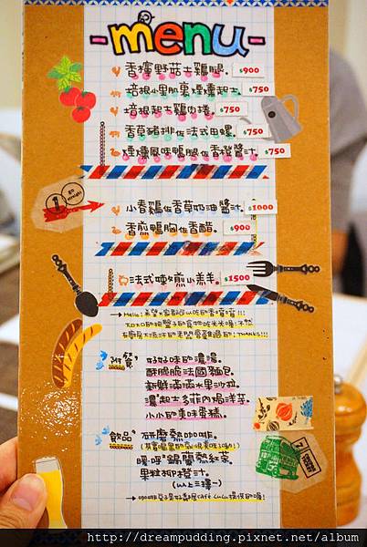 很可愛的手工MENU,價格都是套餐價,附濃湯、沙拉、焗洋芋、蛋糕跟飲料。而每日可能還會有隱藏菜色,像我們這天就有豬豬豬。