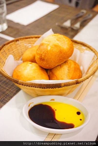 小圓法國麵包,搭配油醋醬,烤的熱燙的小圓麵包外酥內鬆軟,還可以續喔!不過我們都沒續,因為來吃過香妍的都知道,吃完整份套餐,一定會讓你飽飽飽,食量比較小的還要帶便當盒來裝......