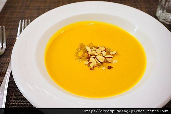 這天的南瓜濃湯十分香甜,加了許多甜脆的玉米粒及杏仁片,讓口感變得十分豐富。
