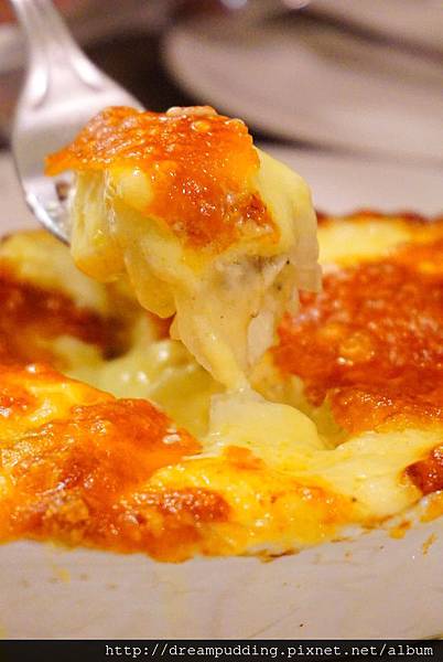 馬鈴薯切茄薄片,加蒜片跟起士進烤箱焗烤,口感香濃到位,還有細微的蒜片辛香感,我超愛的!
