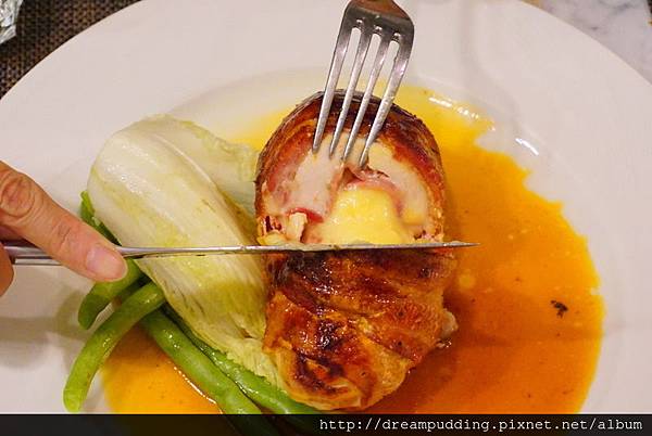 切開後就能看到那融化的金黃的起司彷彿要傾洩而出。粗曠的培根搭配細緻的雞肉還有潤澤的起士,一整個就是讓人很滿足,而一旁的配菜也超清甜的!我超愛娃娃菜^^