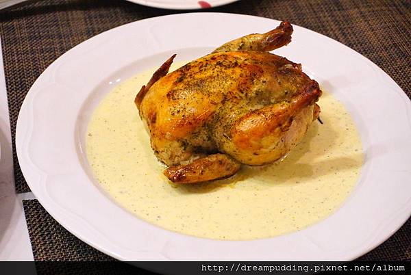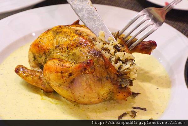 小春雞裡塞滿了野米跟細碎的菇,嚐起來有嚼勁且入味,雞肉也不乾柴,沾取奶油醬汁吃,很香濃。