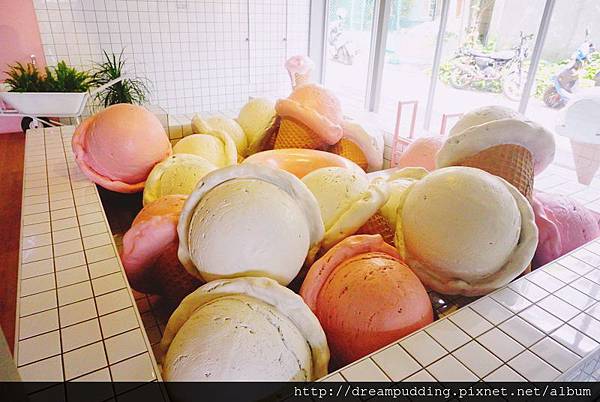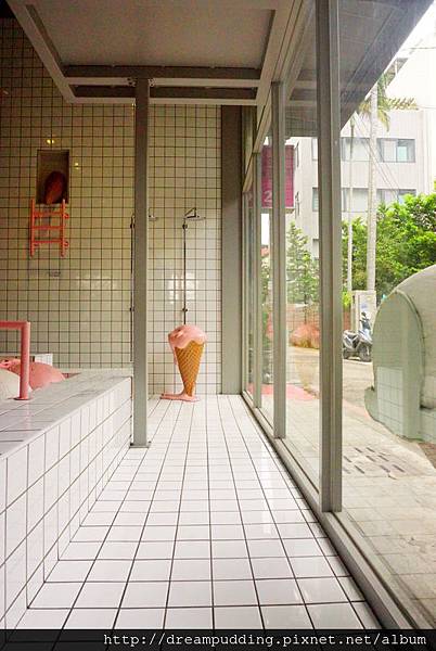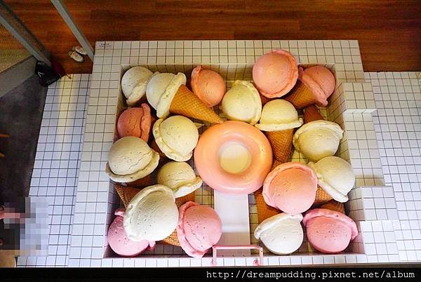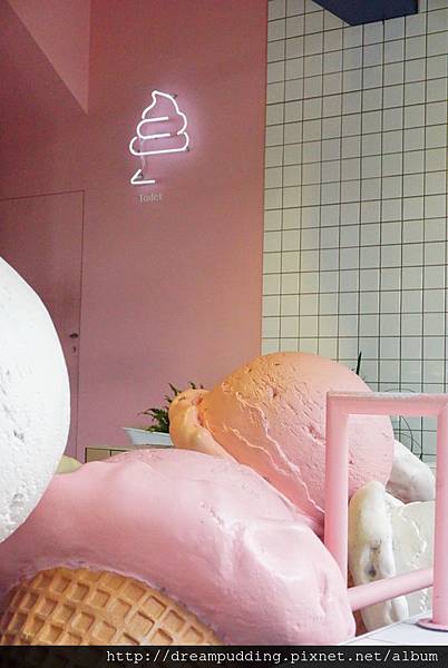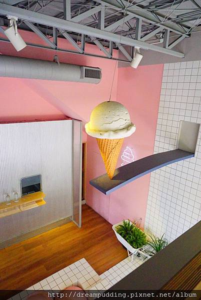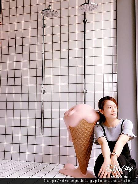 而在一樓的冰淇淋池旁還有甜筒在淋浴的造景,潔白發亮的磁磚,臨窗透進的陽光,這裡一整個就是拍自照照的寶地阿。