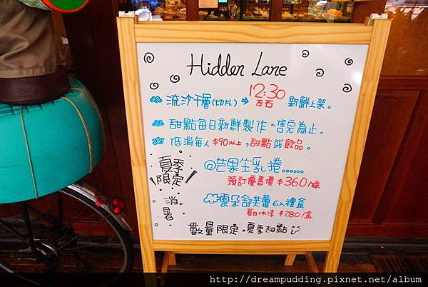 最受歡迎的千層這天是大約12點30分才製作好,所以如果太早來也是需要等待的,內用有90元的低消限制,而一些季節限定的甜點也有寫在門口的白板上。