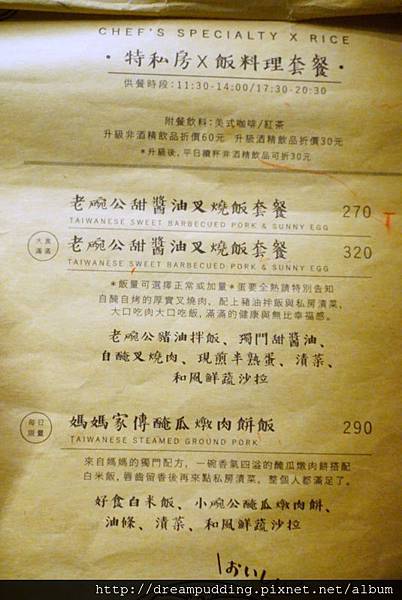 價位的話,我覺得就是台北餐廳會有的價位,但是沒有收服務費,所以在台北來說應該算平價吧(MENU擷取自特有種商行FB粉絲頁)