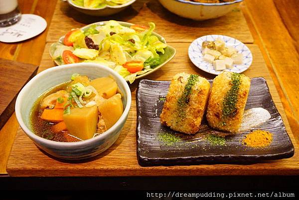 現烤手作雞腿肉飯糰套餐,NT 320元。有兩顆烤飯糰、生菜沙拉、漬菜跟馬鈴薯燉肉。