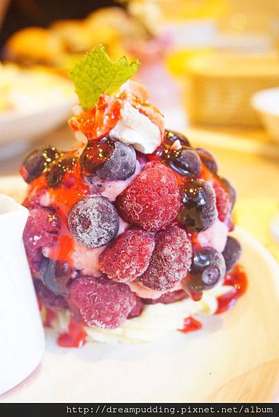 莓果塔是許多莓果類包覆著草莓冰淇淋,莓果都還有點凍感。