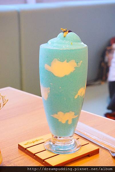 療癒系的藍色冰沙,口感很濃,有點像濃郁再濃郁的養樂多冰沙,但因為有白色雲朵奶油,所以口感多了股香濃,蠻甜的,要趁冰喝,退冰後會感覺更甜。