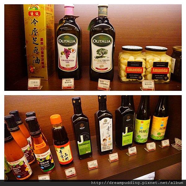 而店內烹調所使用的食材及調味品也都展覽於架上可以選購,而這些調味品,有許多都是在販售有機商品的店家看得到的,東方喜悅所使用的食材,從調味料及油品都看得出其講究。