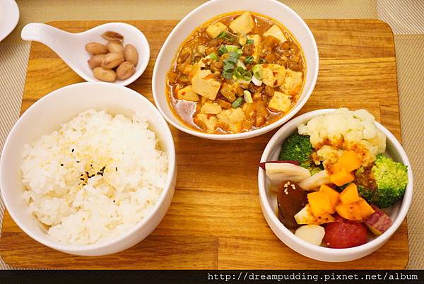 這套餐是麻婆豆腐(五辛素),會附上一碗白飯及蔬果沙拉還有涼拌小菜。