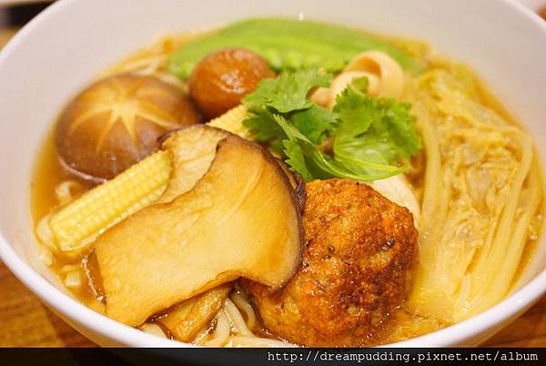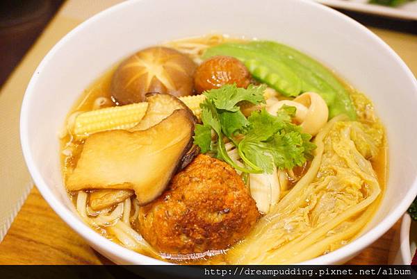 獅子頭為自家手工特製,配菜有清甜的娃娃菜、爽脆的白精靈菇、大片杏鮑菇、肥厚甜美的香菇、玉米筍、清脆的豌豆莢及整顆栗子。