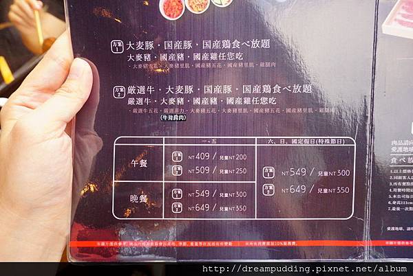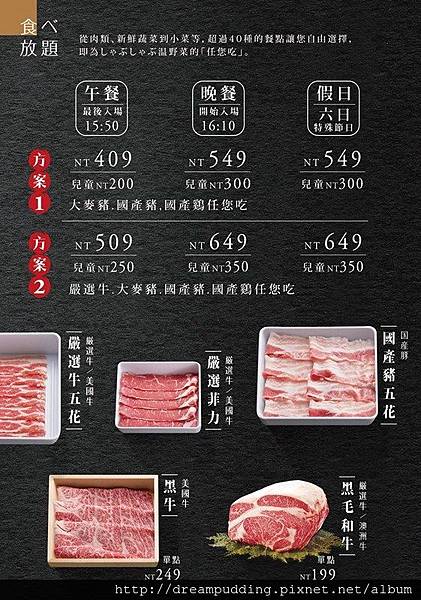 店內的MENU有將肉品細分出來,豬雞放題有5種肉品;而牛豬雞放題則有7種肉品,我們都想吃牛肉,所以選擇了牛豬雞放題,但後來發現,我們戰力太弱.....温野菜的肉質也很好,所以其實選一般的豬雞放題就好了啊>////<。