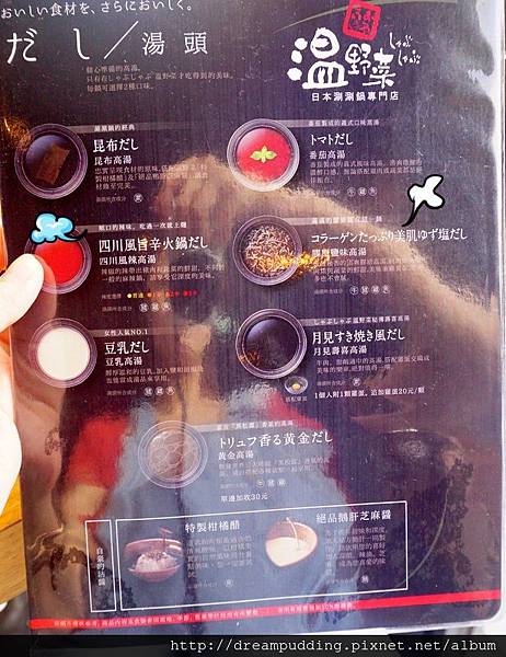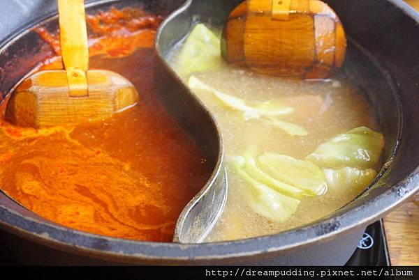 右邊紅色的是四川風辣高湯,左邊是膠原鹽味高湯,鹽味高湯加了柚子皮,嘗起來有淡淡芳香,挺清爽,我們都蠻喜歡的,四川風辣高湯麻辣感不明顯,湯頭有點甜辣的感覺,我們比較不習慣。