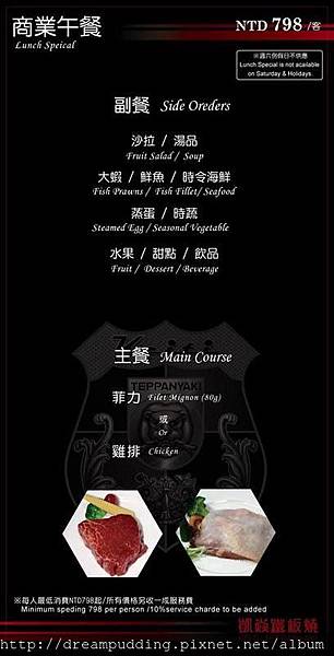 這天跟友人點了一份商業午餐跟一份海陸套餐;而主餐部份我們都選擇了牛肉,各別是菲力跟頂級沙朗。