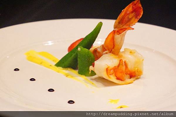 雖說是草蝦,但個頭很大一個;建議一開始先品嘗那Q彈緊緻的彈跳原味,爾後再依喜好沾附一旁的蜂蜜芥末醬及巴薩米可醋,讓層次感一步步提升;最喜愛的就是躲在大蝦後的那顆蜜番茄,酸甘甜的帶點果肉汁液,超棒。