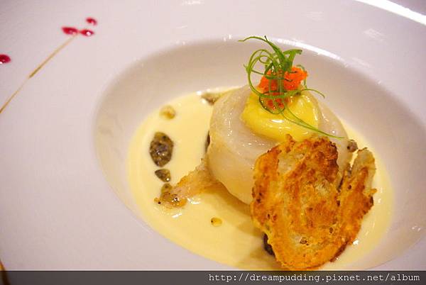 雪花魚被捲成一朵花兒,在由白酒及牛奶調製而成的SAUCE中綻放。魚肉口感軟滑帶嫩,搭配潤澤帶點微甜的SAUCE,讓整體口感更加潤澤;旁邊一片褐黃的是鍋巴片,香酥帶點細微的鹹,跟魚肉一塊吃,增添了另一種風味,而最頂端的魚卵跟滴落在乳白SAUCE中的黑松露醬,更是讓整體風味更加地有層次。