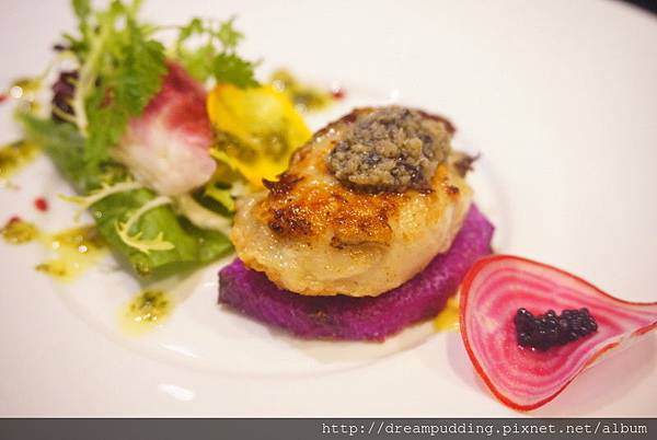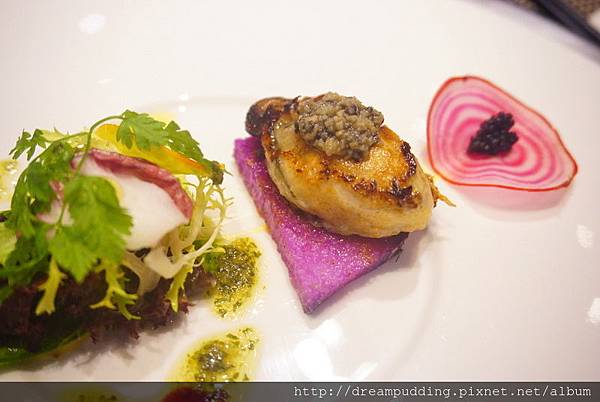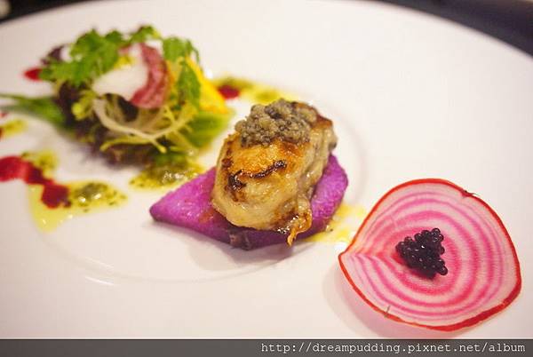 這擺盤猶如一幅畫般,如萬花筒般的紅白圈圈漩渦是櫻桃蘿蔔薄片,圈圈裡還鑲著魚子醬維持平衡;去殼生蠔口感新鮮軟嫩,肥厚豐腴,搭配著松露醬一塊吃,能增加層次感,底部的紫色山藥以及一旁附的法國生菜,讓口感能多了股小清新。