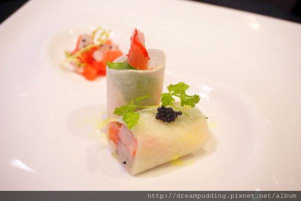 這天的海陸套餐前菜是蔬果海鮮卷,薄透的外皮是洋地瓜(豆薯),裏頭包有蟹肉棒、火龍果及西瓜,口感爽脆且新鮮香甜,好吃