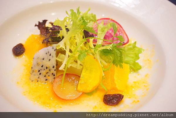 法式酸醬翠玉蔬果沙拉,採用的是法國進口蔬菜,有很可愛的名字,紅捲跟綠捲,口感新鮮且清酸開胃。