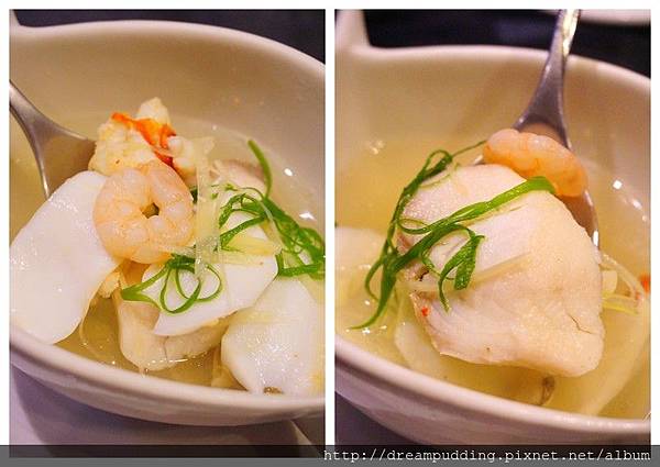 澄澈鮮甜的湯裡有著滿滿的魚料,蝦仁、魚肉塊、蟹肉、花枝,超豐盛的一碗。