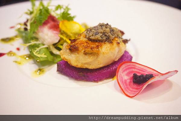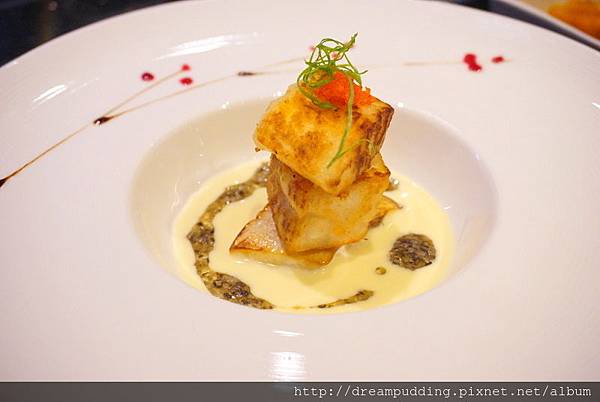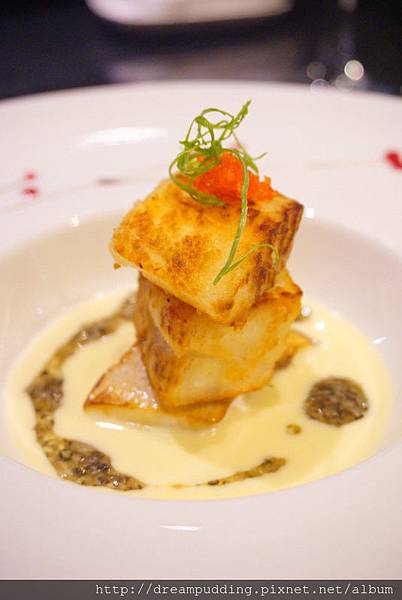 圓鱈給的很多塊,煎的外頭微微的酥,內部卻是細嫩,口感雅致;而底部的乳白色,由白酒及牛奶在滴上松露醬調製而成的SAUCE,真的很百搭,無論搭什麼魚都好吃耶!