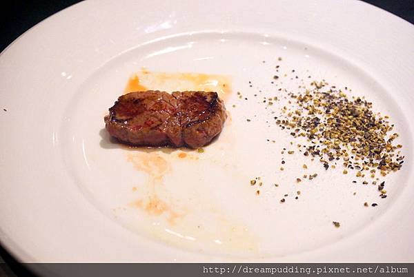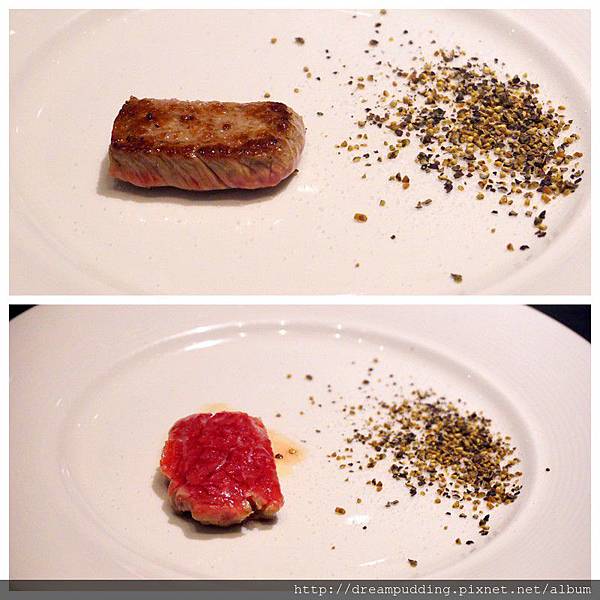 一開始,主廚會先煎原味跟一般熟度,讓顧客品嘗,然後再依顧客喜好決定熟度;我跟友人都喜歡吃生一點的牛肉,感覺比較鮮甜,所以主廚就幫我們把牛肉煎熟一面,完全客製化。