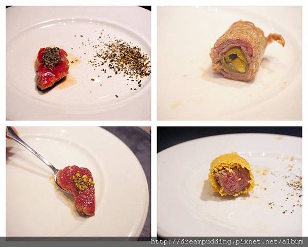 爾後每一口都會製作成不同風味,有松露醬、蒜味醬,還有特殊的剝皮辣椒沙朗(圖右上,這個超好吃!),口感鮮美帶點微辣;圖右下的帕馬森起司捲牛肉口感也很豐厚濃郁。