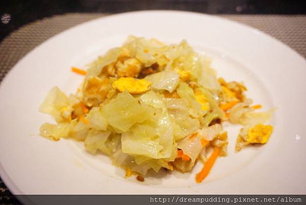 採用梨山高麗菜跟荷包蛋一塊炒,口感脆甜,再加上些許的醃漬洋蔥會更加有層次感。