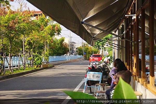 位於小河流旁的道路為單行道,來往的車很少,陽光、綠樹、道路,坐在這,可以很靜謐的享受一個人的下午。